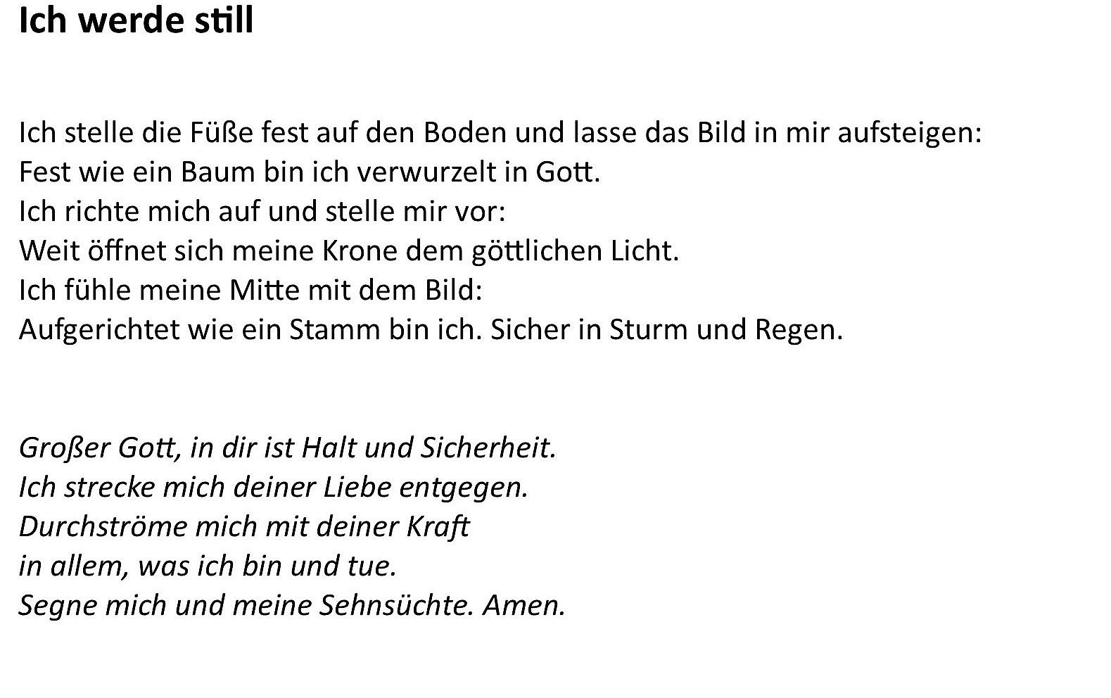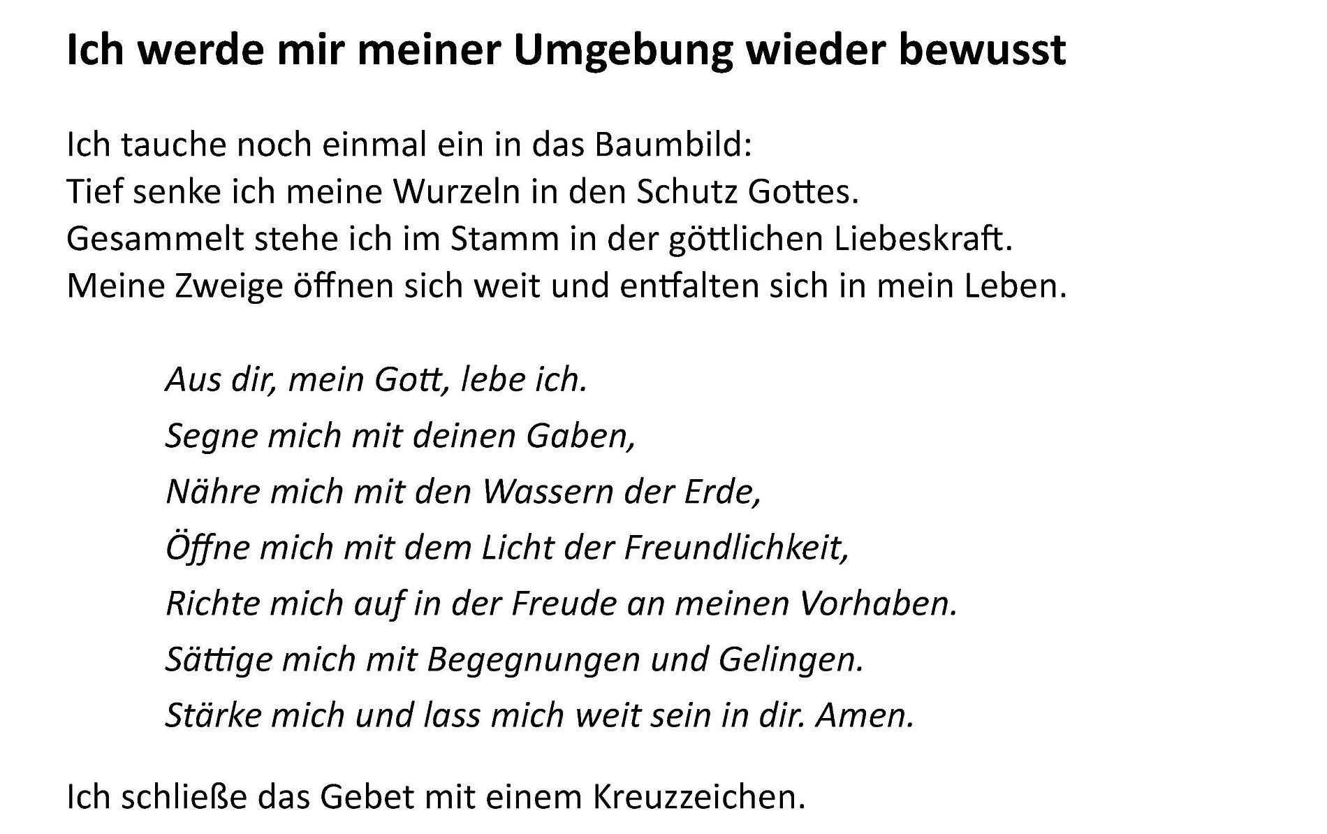 In der Karte „Deckblatt“ ist die Handhabung erläutert: es wird vorgeschlagen, ihr Gebet jeweils mit der Karte „sich öffnen“ zu beginnen und - nachdem Sie die Tageskarte angeschaut haben- mit der Karte „ausklingen lassen“ zu beenden. Sie werden merken, dass dieses Jahr das Grundgebet dem Bild des Baumes folgt. Der Baum ist ein Symbol der menschlichen Geborgenheit. Das Wurzelwerk wird als unsere tiefen Verwurzelung in Gott, dem Schöpfer, geschaut, der Stamm als unser Halt in Christus und die Krone als unsere Außenaktivitäten des Heiligen Geistes.