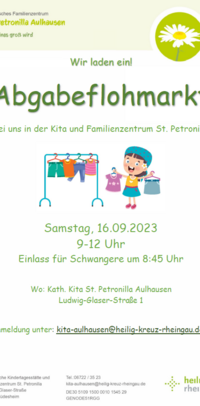 Pfarrei Heilig Kreuz Rheingau Kirchorte St. Petronilla Aulhausen Abgabeflohmarkt im Familienzentrum Familienzentrum Aulhausen 29.06.2023 Abgabeflohmarkt im Familienzentrum Notiert Euch schon jetzt den