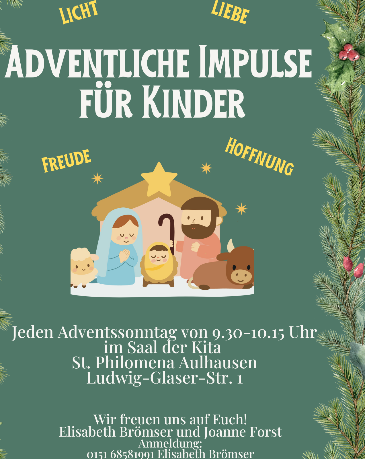 Jeden Adventssonntag finden in der Kita St. Philomena adventliche Impulse für Kinder statt. Sie beginnen um 9.30 Uhr und dauern ca 45 Minuten.