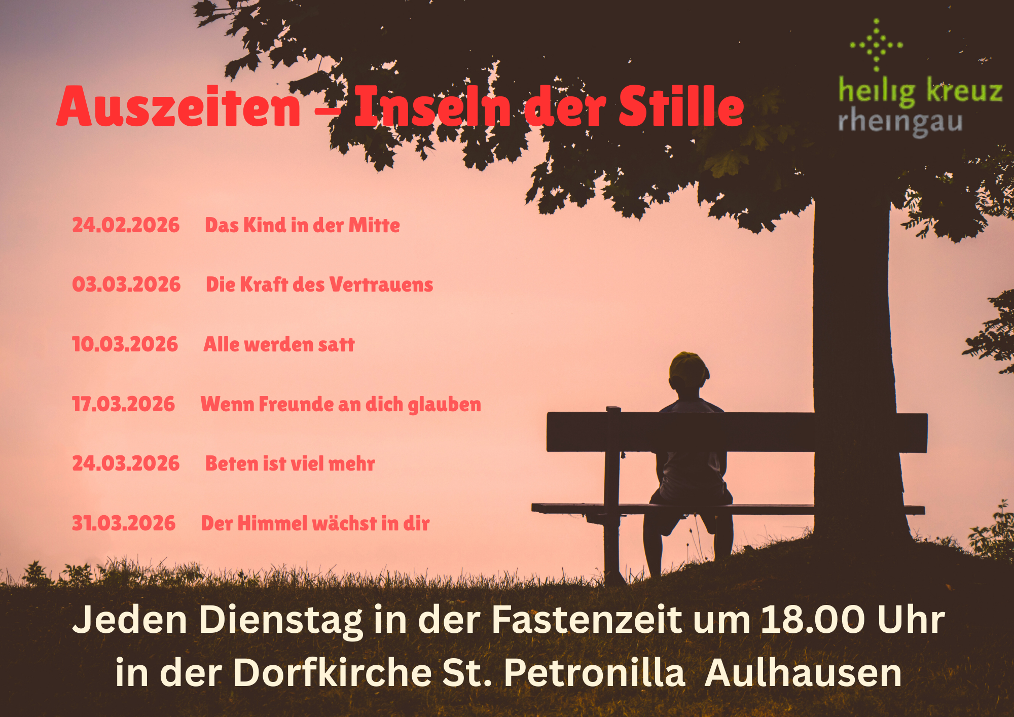 An allen Dienstagen in der Fastenzeit finden jeweils um 18.00 Uhr weitere, halbstündige Auszeiten in der Dorfkirche im Aulhausen statt, zu der Alle recht herzlich eingeladen sind!